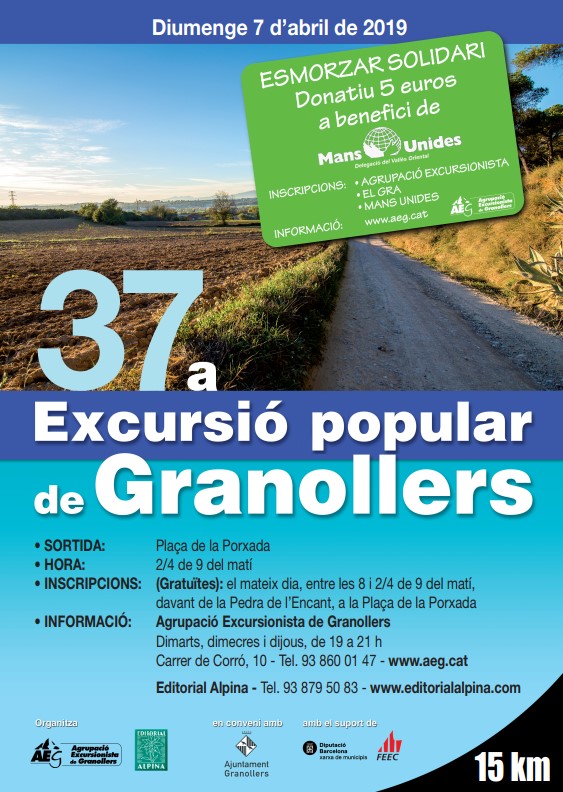 El proper diumenge 7 d'abril se celebrarà la 37ena edició de l'Excursió Popular, de nou de la mà de Mans Unides amb opció de participar a un esmorzar solidari per 5 euros. El recorregut té una distància de 15 km i les inscripcions es poden fer el mateix dia entre les 8 i 2/4 de 9 a la Plaça de la Porxada. Si es desitja participar a l'esmorzar solidari cal inscriure's prèviament al GRA, a l'Agrupació Excursionista o a Mans Unides. Per a més informació podeu fer clic aquí.